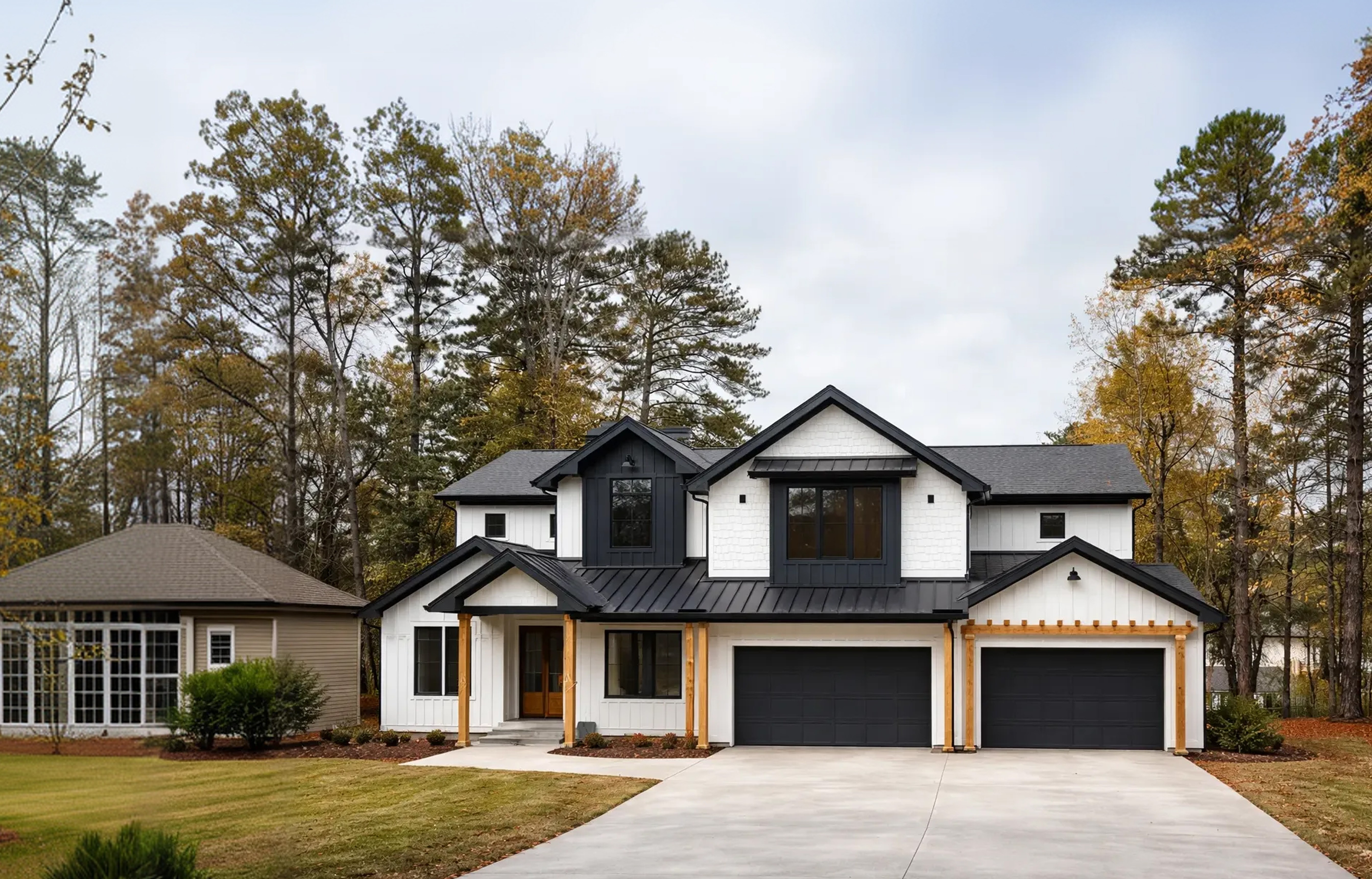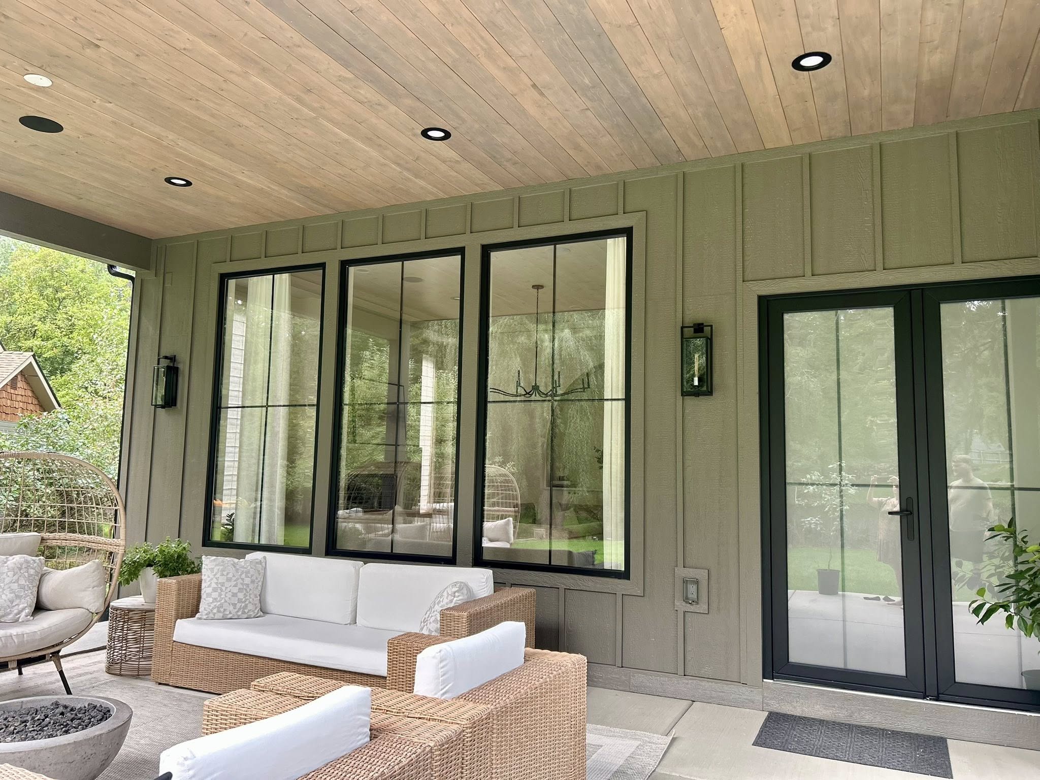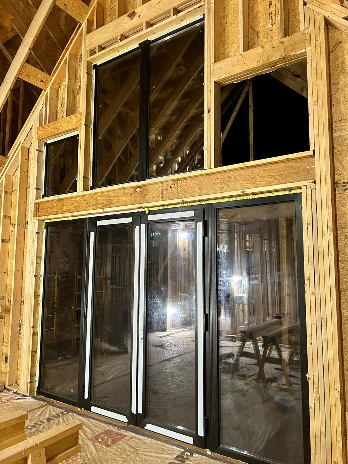 ASCO completed a full installation package for this new construction modern farmhouse, supplying and setting black-framed windows and multiple exterior door units. The scope included large picture windows, tall narrow openings, and patio/entry door installations, all aligned and sealed for a clean finish and dependable performance.