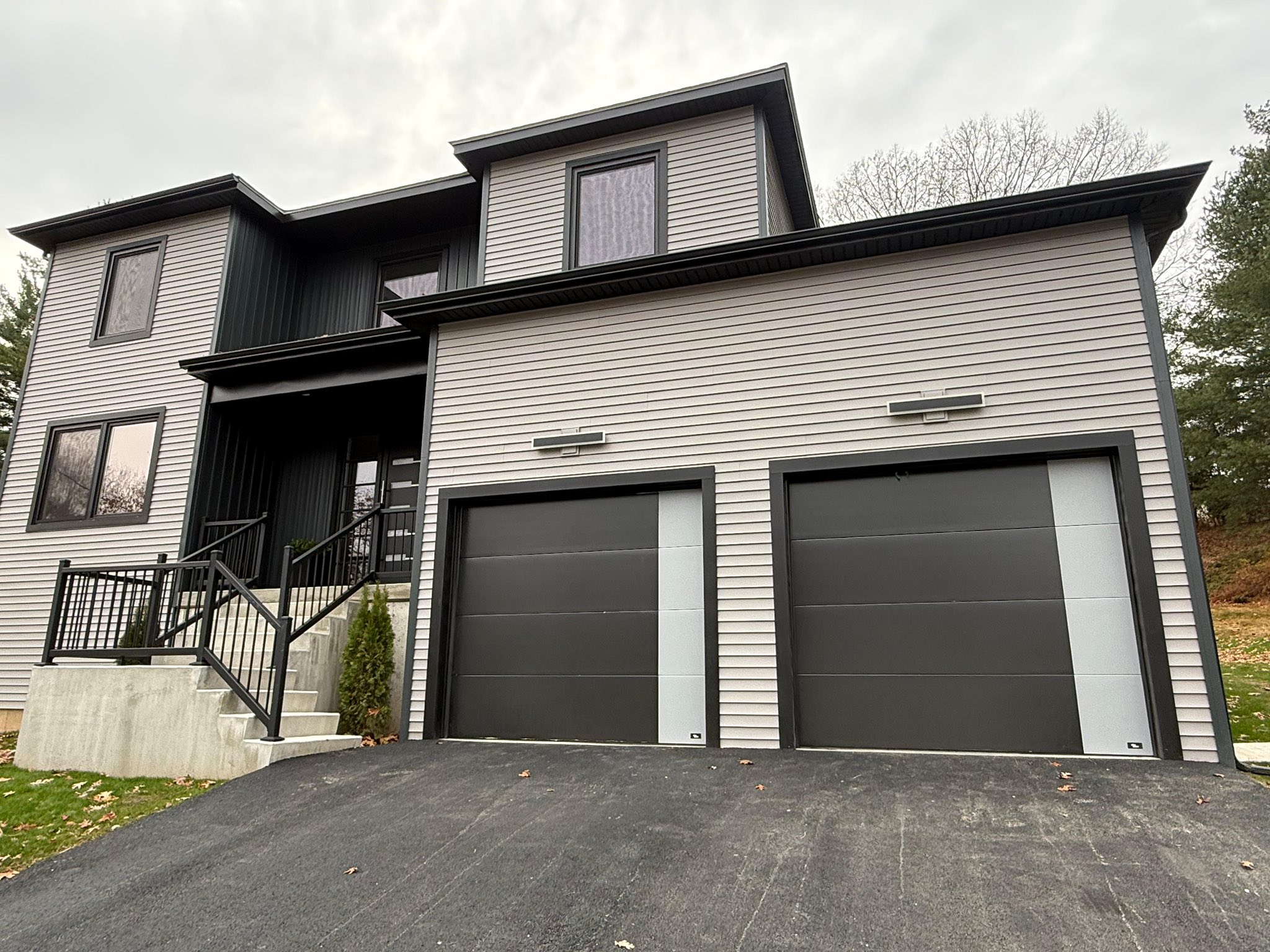 Comprehensive exterior glazing upgrade featuring installation of large-format energy-efficient window systems and a matching insulated patio door with black aluminum frames. The expansive glass units maximize natural light, create seamless indoor-outdoor visual continuity, and enhance the contemporary architectural character of the home. High-performance insulated glazing improves thermal efficiency, airtightness, and long-term durability while ensuring precise alignment, clean trim detailing, and flawless integration with the façade materials.