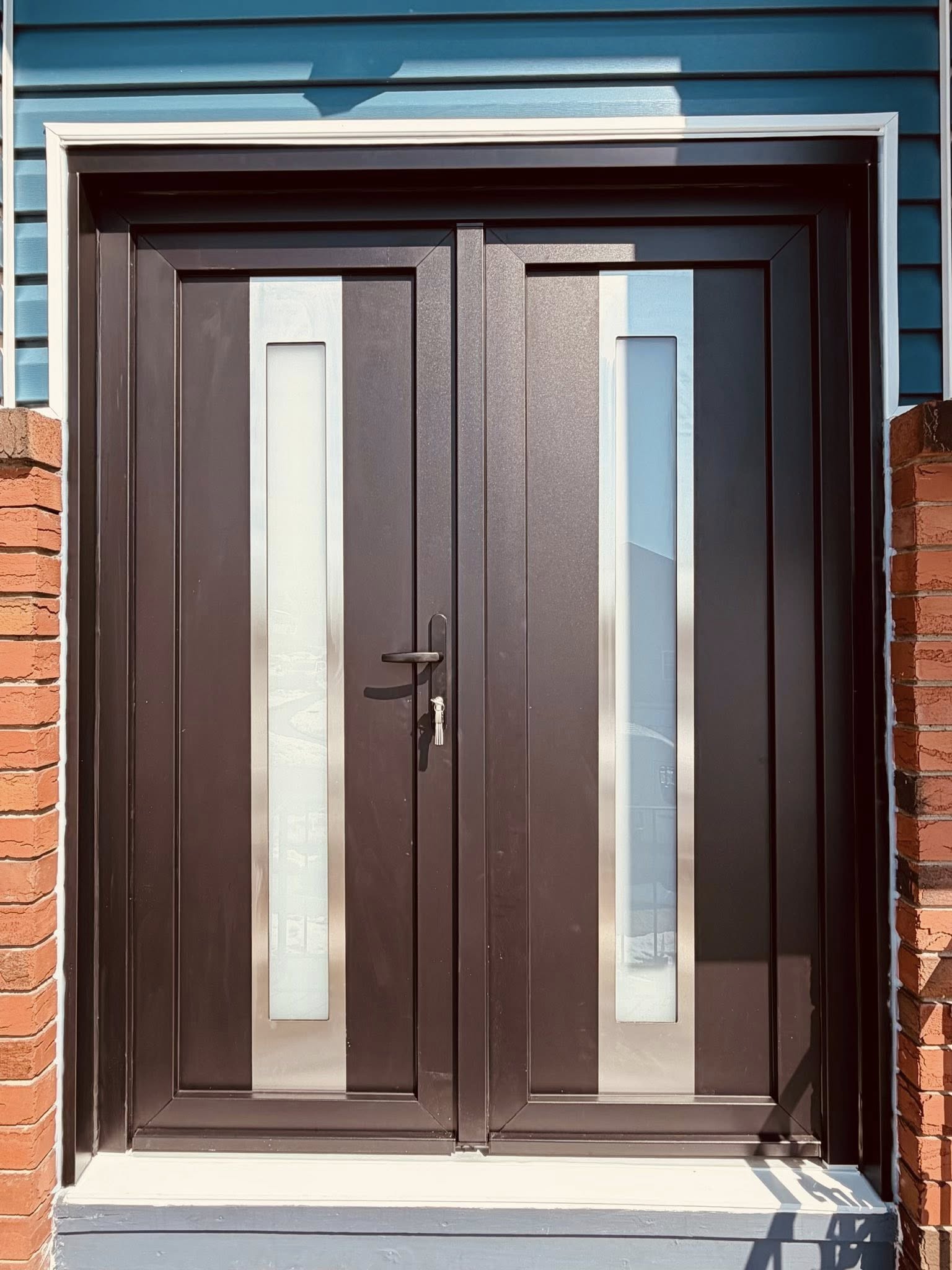 Residential renovation project in New York featuring a modern double entry door replacement. The new insulated steel door system with vertical glass inserts improves security, thermal performance, and natural light at the entrance. Clean exterior finishing and precise installation enhance both curb appeal and long-term durability.