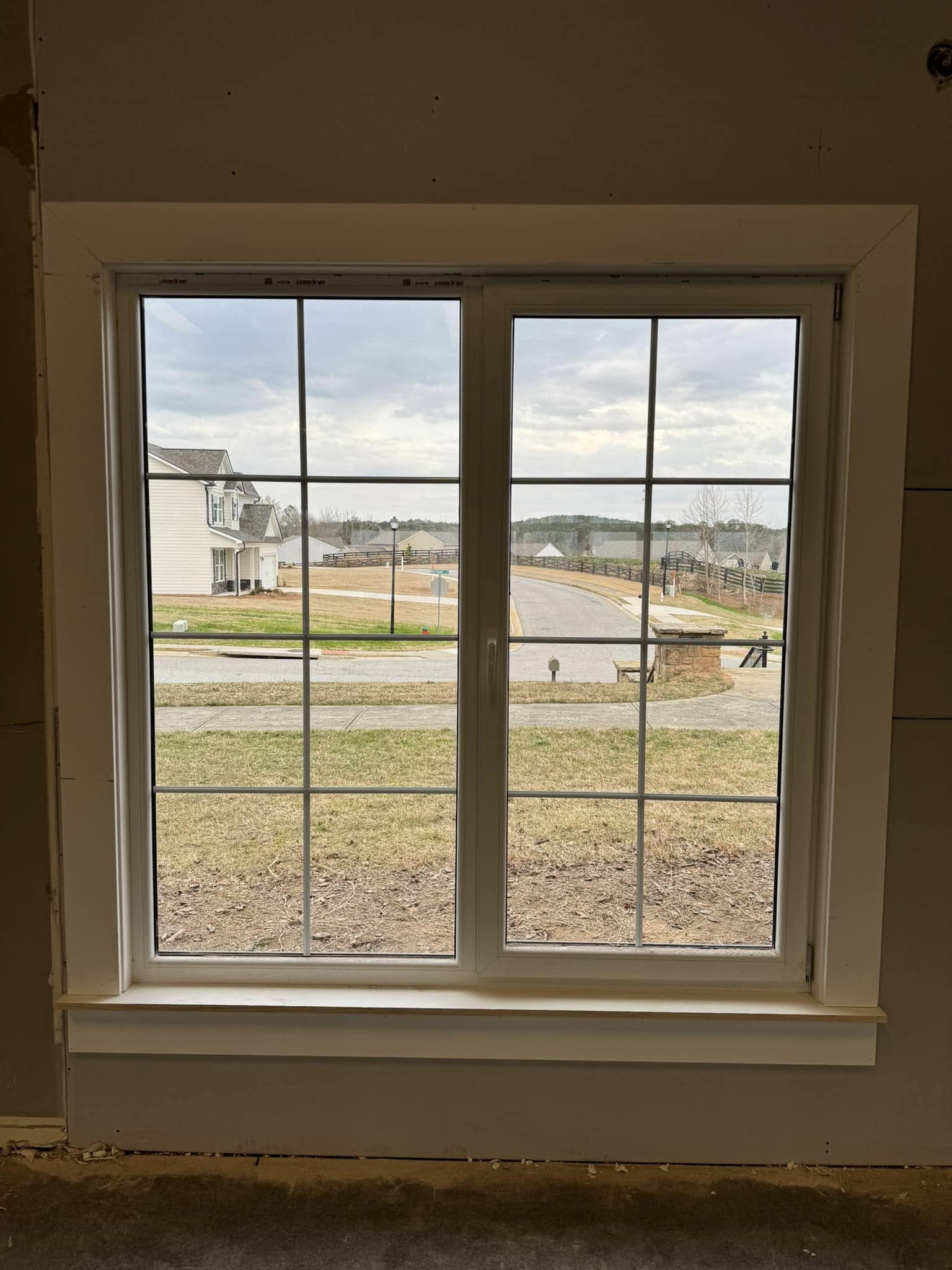 Professional installation of energy-efficient PVC window systems as part of a new residential construction project. The design features traditional grille patterns that enhance architectural character while maintaining modern thermal performance standards. High-performance insulated glazing improves energy efficiency, reduces air infiltration, and ensures long-term durability. Precise alignment, proper flashing integration, and clean interior trim finishing provide seamless compatibility with the building envelope and deliver a refined exterior appearance.