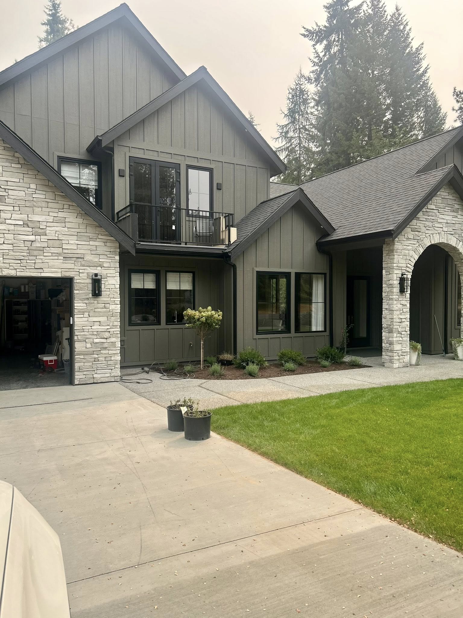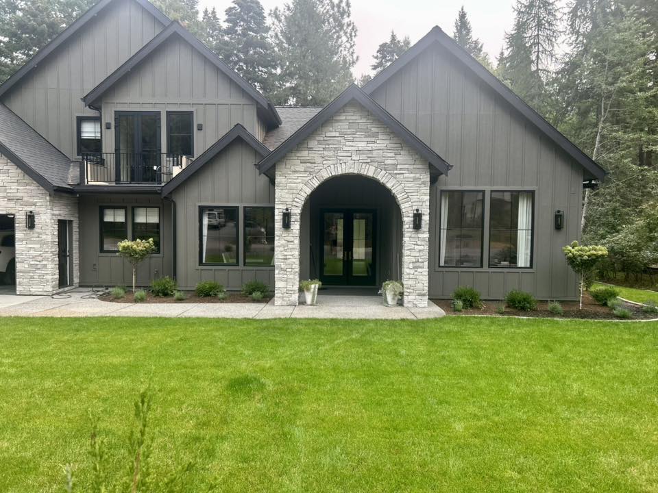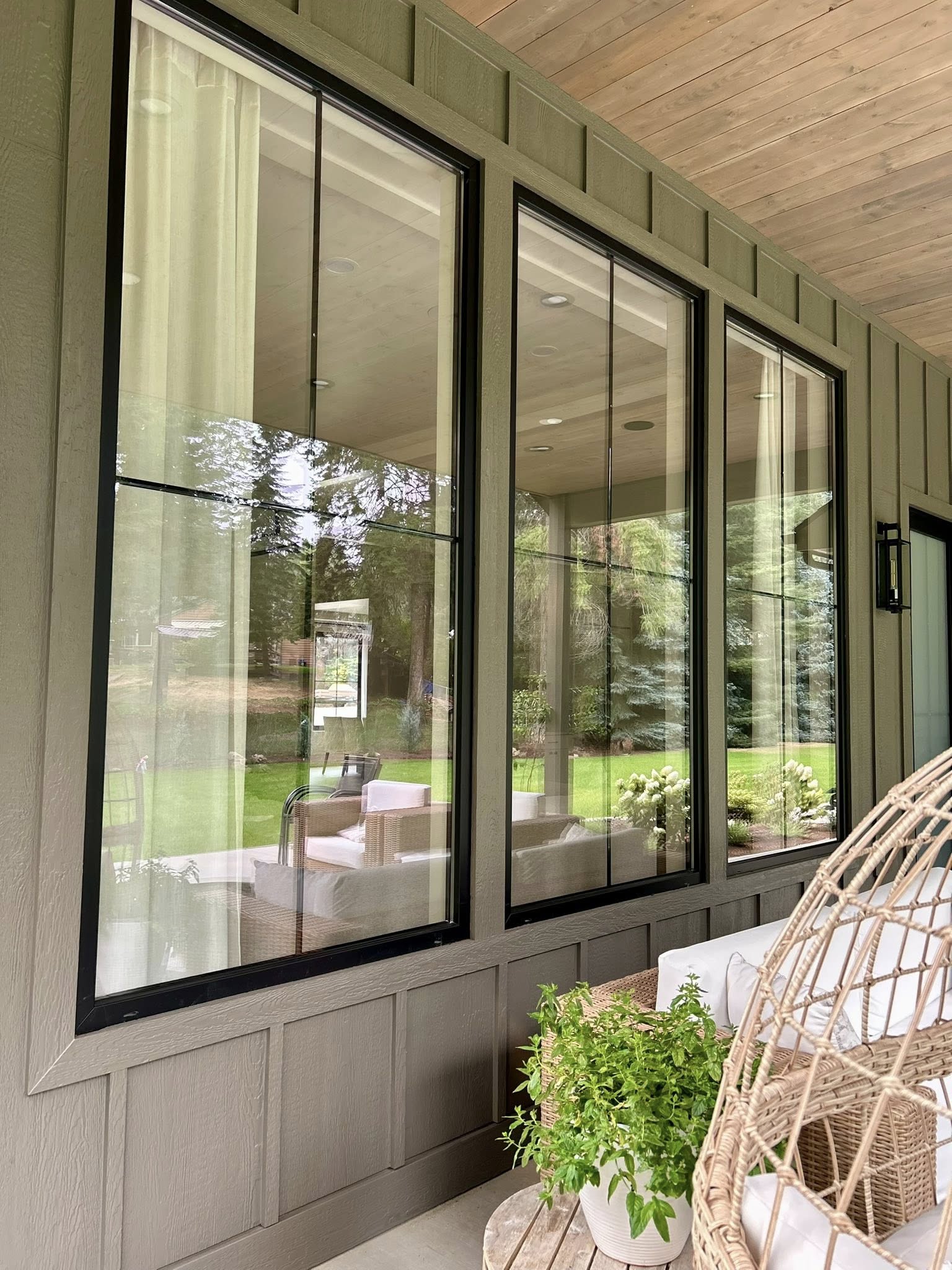 Comprehensive exterior glazing upgrade featuring installation of large-format energy-efficient window systems and a matching insulated patio door with black aluminum frames. The expansive glass units maximize natural light, create seamless indoor-outdoor visual continuity, and enhance the contemporary architectural character of the home. High-performance insulated glazing improves thermal efficiency, airtightness, and long-term durability while ensuring precise alignment, clean trim detailing, and flawless integration with the façade materials.