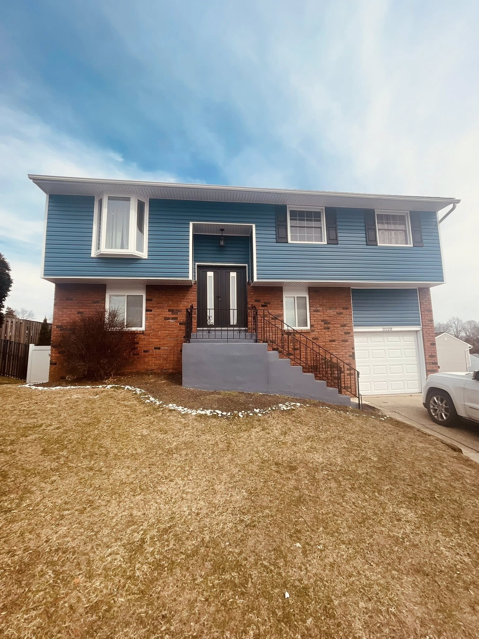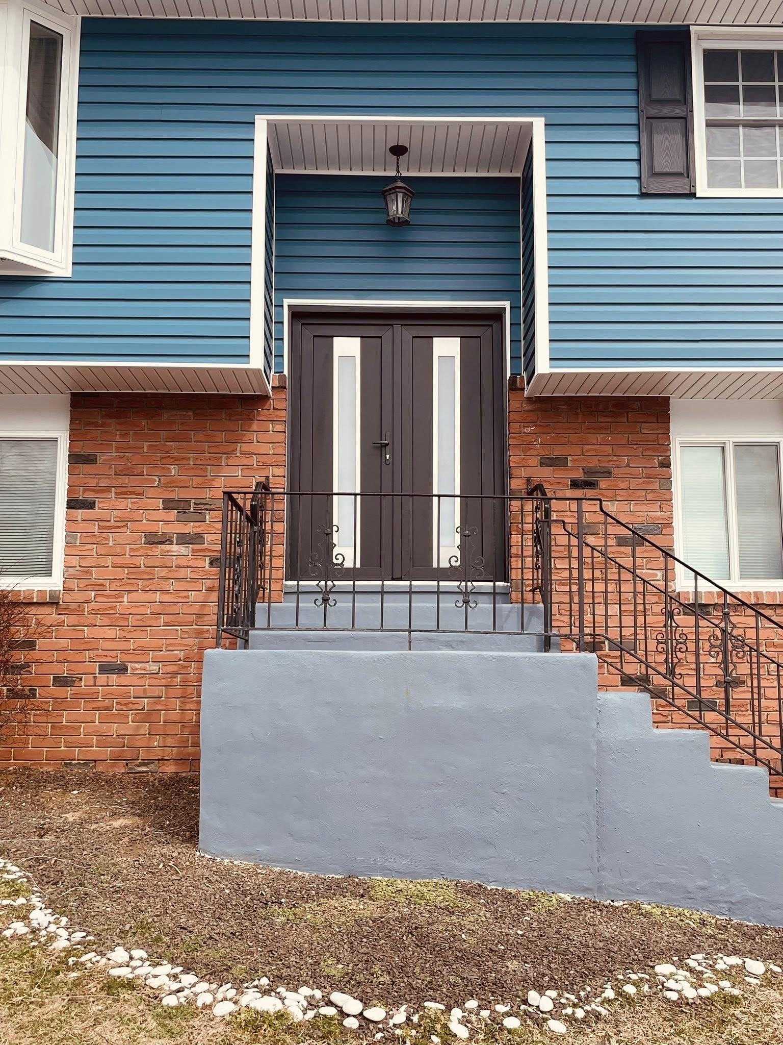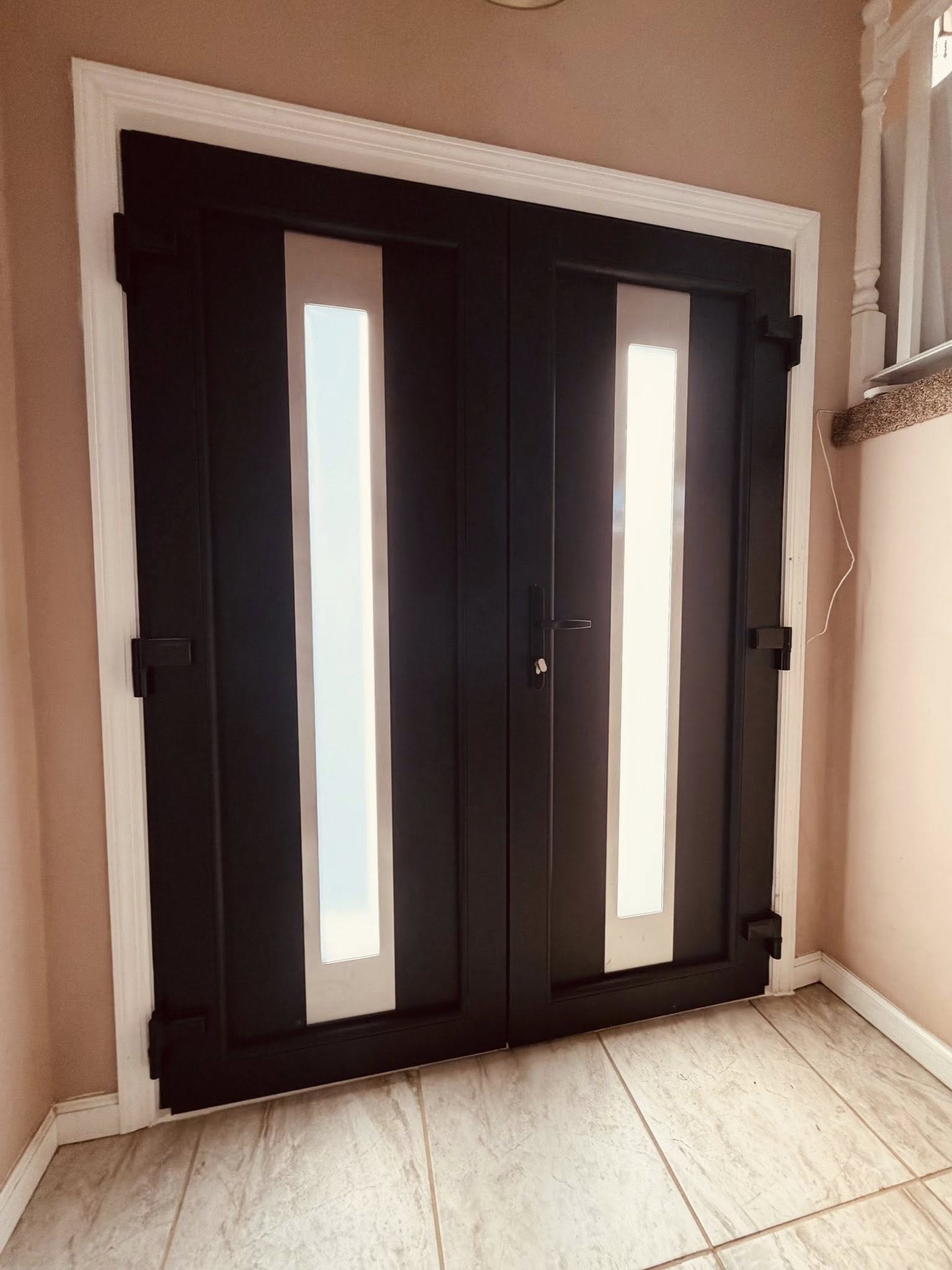 Residential renovation project in New York featuring a modern double entry door replacement. The new insulated steel door system with vertical glass inserts improves security, thermal performance, and natural light at the entrance. Clean exterior finishing and precise installation enhance both curb appeal and long-term durability.